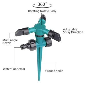 Premium Material – The Three-arm Rotating Sprinkler is made of durable ABS and leak-proof design, which will enable stable performance, make full use of water resource to achieve the most effective irrigation effect. The three-arm nozzle also can adjust the sprinkling angle to direct or 45 degrees for a different need.