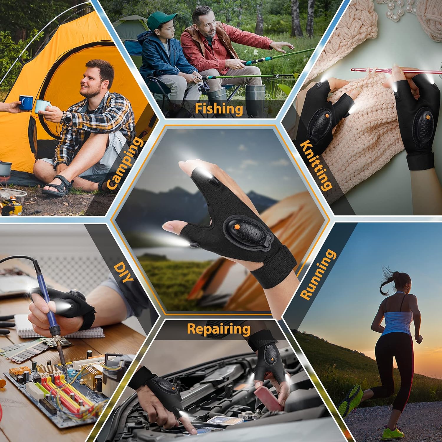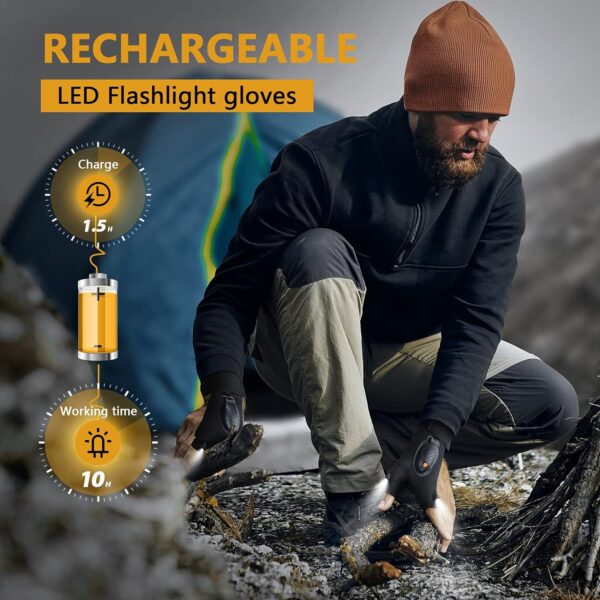 REUSABLE & BRIGHT LIGHTED HANDS-FREE GLOVES TO SPEED UP WORK: Bright led flashlight gloves and convenient charging methods are already pioneering. Our led lighted gloves can boost efficiency in the dark when you do some repair work, DIY or other outdoor activities, like fishing, repairing, camping, reading, hiking, running, walking the dog, etc. The fingerless light gloves for men are not only cool stuff gadgets but also funny fishing gifts that will make your life easier and more enjoyable.