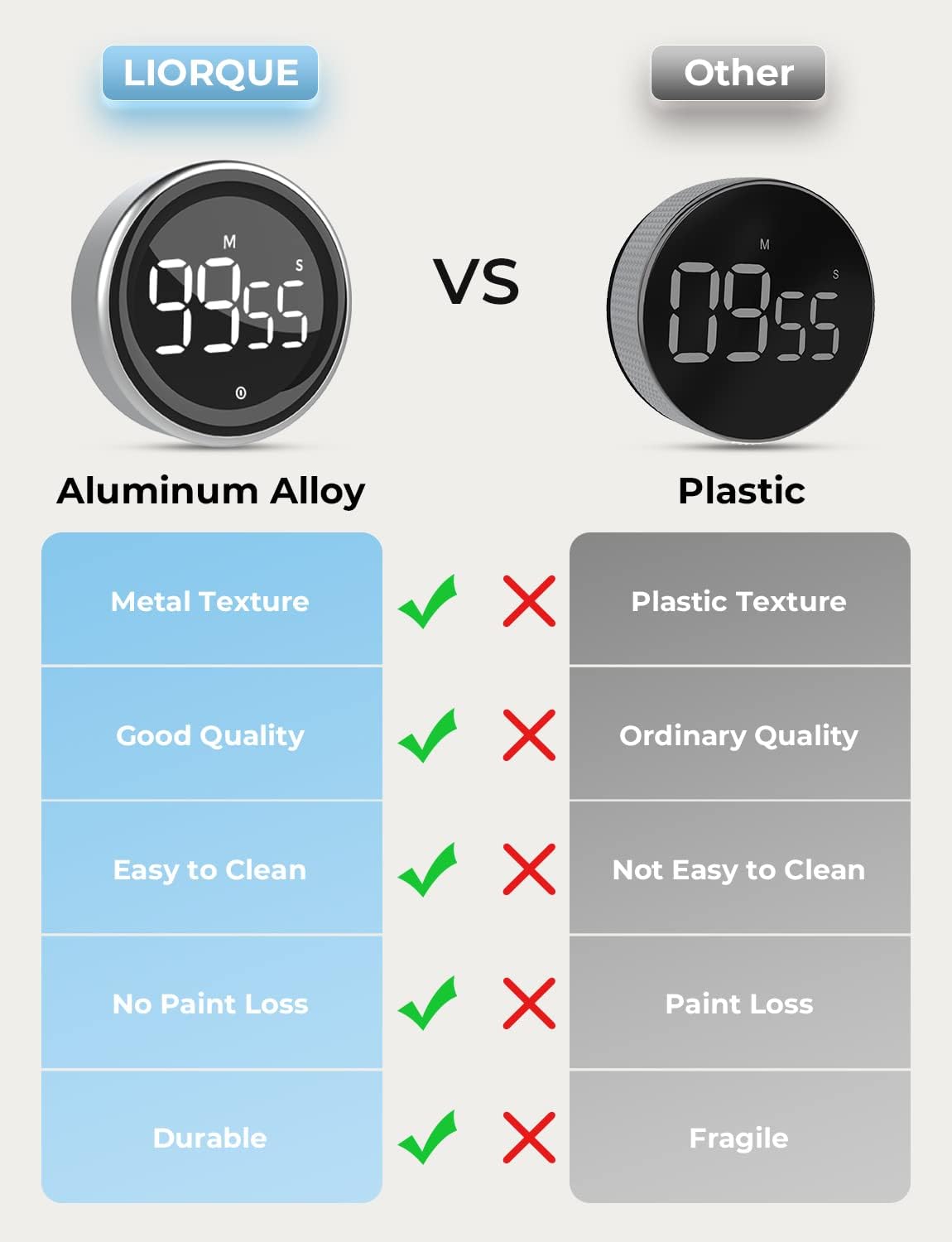 CONSTANT LIGHT/ENERGY SAVING MODE – LIORQUE kitchen timer has 2 brightness modes. Normal Mode: the brightness is constant. Power Saving Mode: the digits will be darken in 5s and shutdown in another 5s when there is no operation, save the battery. To wake up the screen again, just turn the knob but do not press the button.