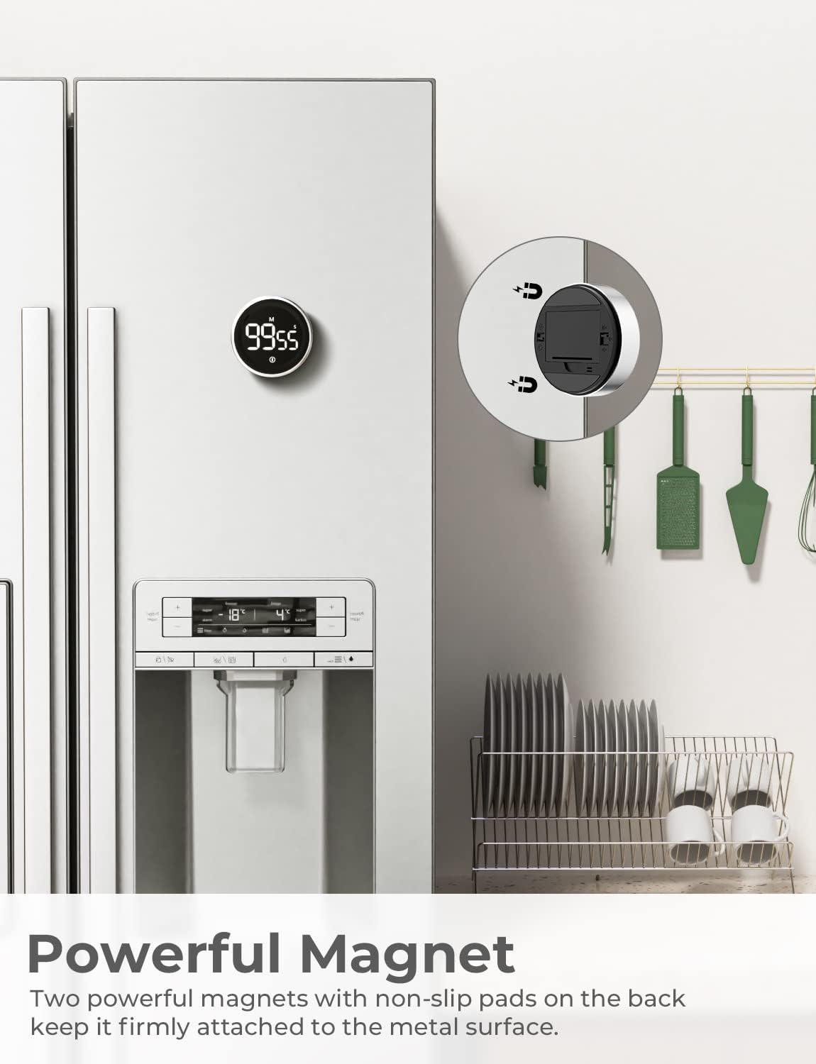 MAGNETIC COUNT UP/DOWN TIMER – Digital timer count down from 99m55s to 0, or as the stopwatch that count up from 0 to 99m55s. With strong magent on its back, you can stick it to cooker, fridge, sports gym, classroom whiteboard or other metal surface. NOTE: PLEASE REMOVE THE TRANSPARENT FILM ON THE 2 SILICONE PADS BEFORE USE.